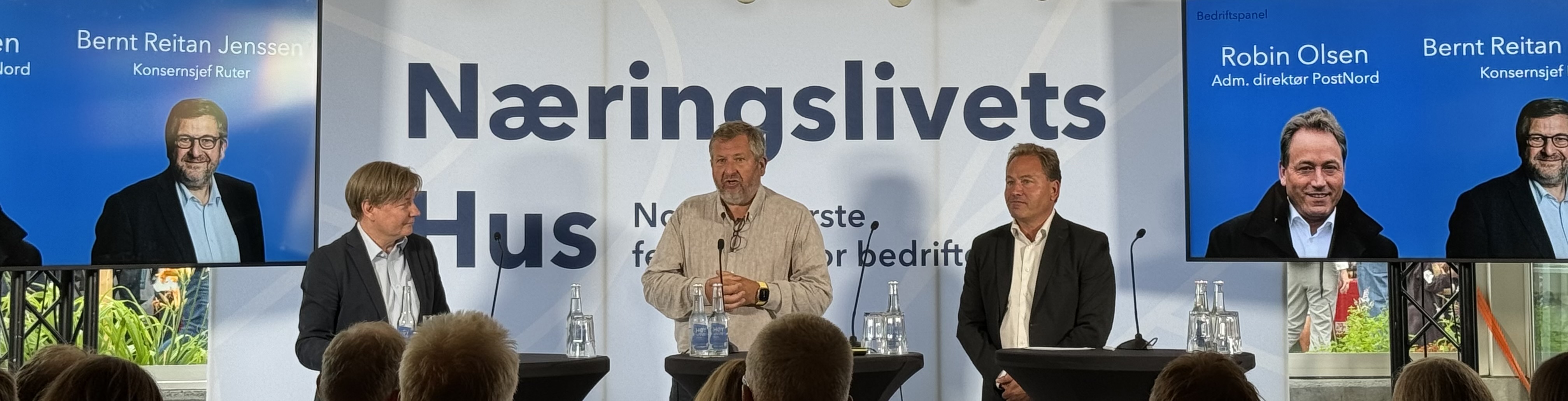 Fra venstre, Ole A. Hagen, næringspolitisk direktør i NHO LT og programleder, Bernt Reitan Jenssen, konsernsjef i Ruter og Robin Olsen, administrerende direktør i PostNord Norge.